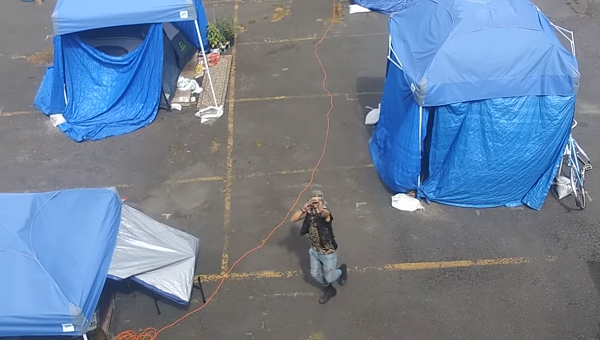 The video creator explains that the tent city is funded by the City of Portland, but there is no evidence presented in the video that supports the funding claim. A privacy fence surrounds the compound, reportedly with a sign that says the location is an “art installation.”